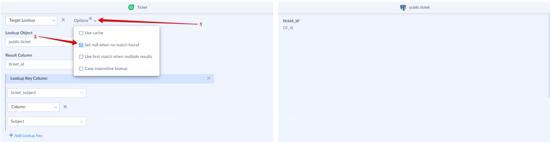 In the Lookup settings, enable the Set null when no record found option. Result: